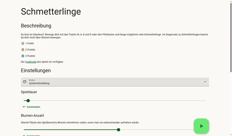 Dieses Browser-Spiel ist im Rahmen des Moduls „Fortgeschrittene Programmierung“ im zweiten Semester meines Studiums entstanden. Es handelt sich um einen modernen Nachbau des Schmetterlinge-Spiels vom Poly-Play-Arcade-Automaten der DDR. Als UI-Bibliothek wird Material Web verwendet.