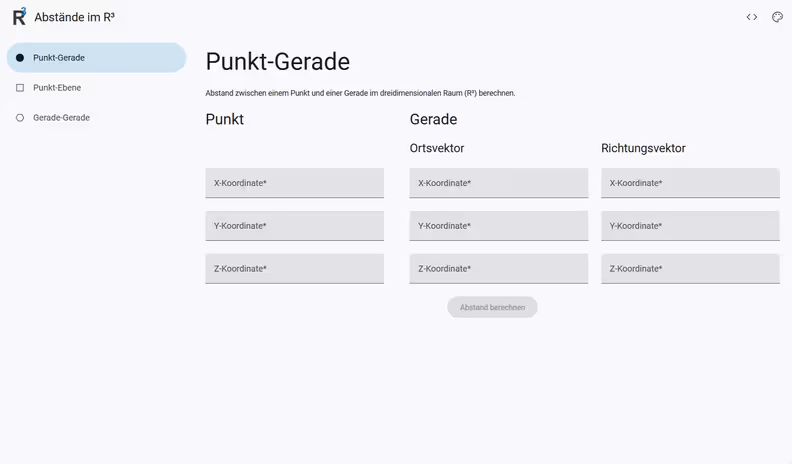 Diese Website ist im Rahmen des Moduls „Lineare Algebra und Operations Research“ im zweiten Semester meines Studiums in Zusammenarbeit mit anderen Studierenden entstanden. Es handelt sich um eine Website, die die Distanzen zwischen Punkt-Gerade, Punkt-Ebene und Gerade-Gerade im dreidimensionalen Raum berechnen kann und die Ergebnisse grafisch darstellt. Für die grafische Darstellung wird p5.js verwendet. Für die Website wird als Framework Astro und als UI-Bibliothek Material Web verwendet.