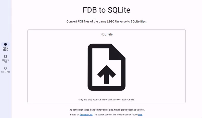 Diese Website ist in meiner Freizeit ursprünglich während meiner Ausbildung entstanden und dient dazu FDB-Datenbank-Dateien des Spiels LEGO Universe zu konvertieren. Es können FDB-Dateien in SQLite-Dateien, SQLite-Dateien in FDB-Dateien und XML-Dateien in FDB-Dateien konvertiert werden. Die Konvertierung findet komplett clientseitig statt. Im Hintergrund wird eine für den Umgang mit FDB-Dateien entwickelte und in Rust geschriebene Bibliothek verwendet, die zu WebAssembly kompiliert wurde. Als UI-Bibliothek wird Material Web verwendet.