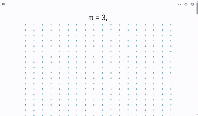 Diese Website ist im Rahmen des Moduls „Diskrete Mathematik und Logik“ im ersten Semester meines Studiums entstanden. So lange die Website geöffnet ist, werden immer weiter Nachkommastellen von Pi generiert. Um mit der Berechnung der Nachkommastellen den Browser nicht komplett zu blockieren, findet die Berechnung in einem WebWorker statt. Als UI-Bibliothek wird Material Web verwendet.