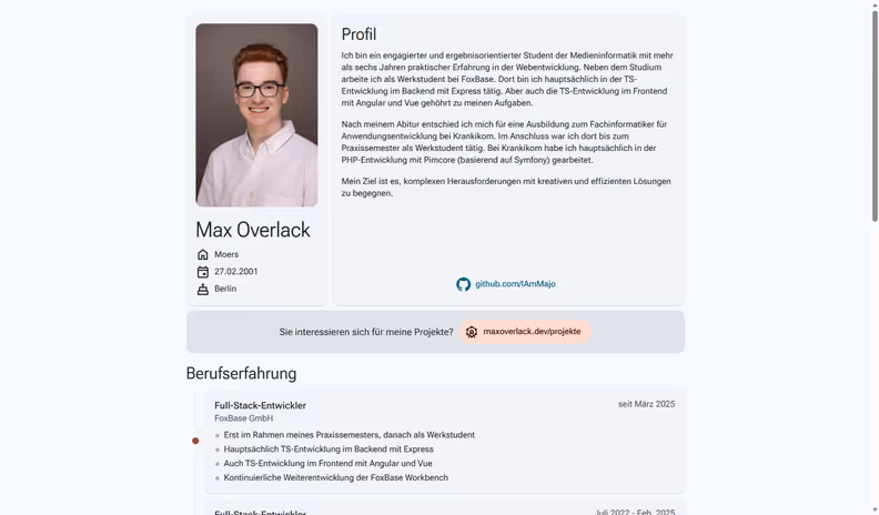 Diese Website ist im Rahmen des Moduls „Webentwicklung“ im fünften Semester meines Studiums in Zusammenarbeit mit anderen Studierenden entstanden. Es handelt sich um ein Frontend für die Semantic Search API der FoxBase GmbH und war ein exploratives Projekt zur Entwicklung eines UIs für AI. Als Framework wurde Nuxt verwendet.